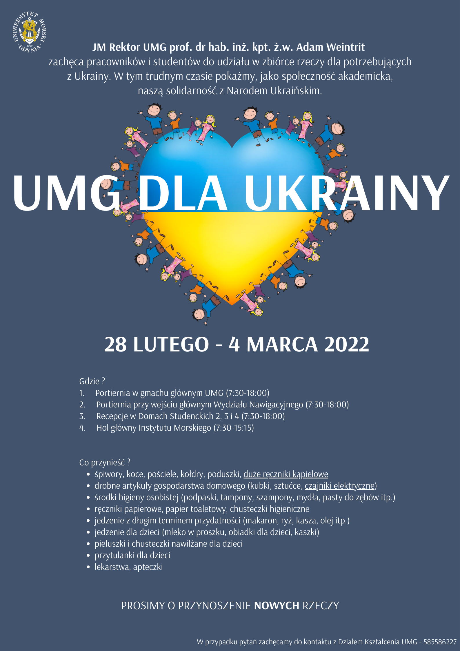 JM Rektor prof. dr hab. inż. kpt. ż.w. Adam Weintrit zachęca pracowników i studentów do udziału w zbiórce rzeczy dla potrzebujących z Ukrainy. W tym trudnym czasie pokażmy, jako społeczność akademicka, naszą solidarność z narodem Ukraińskim.