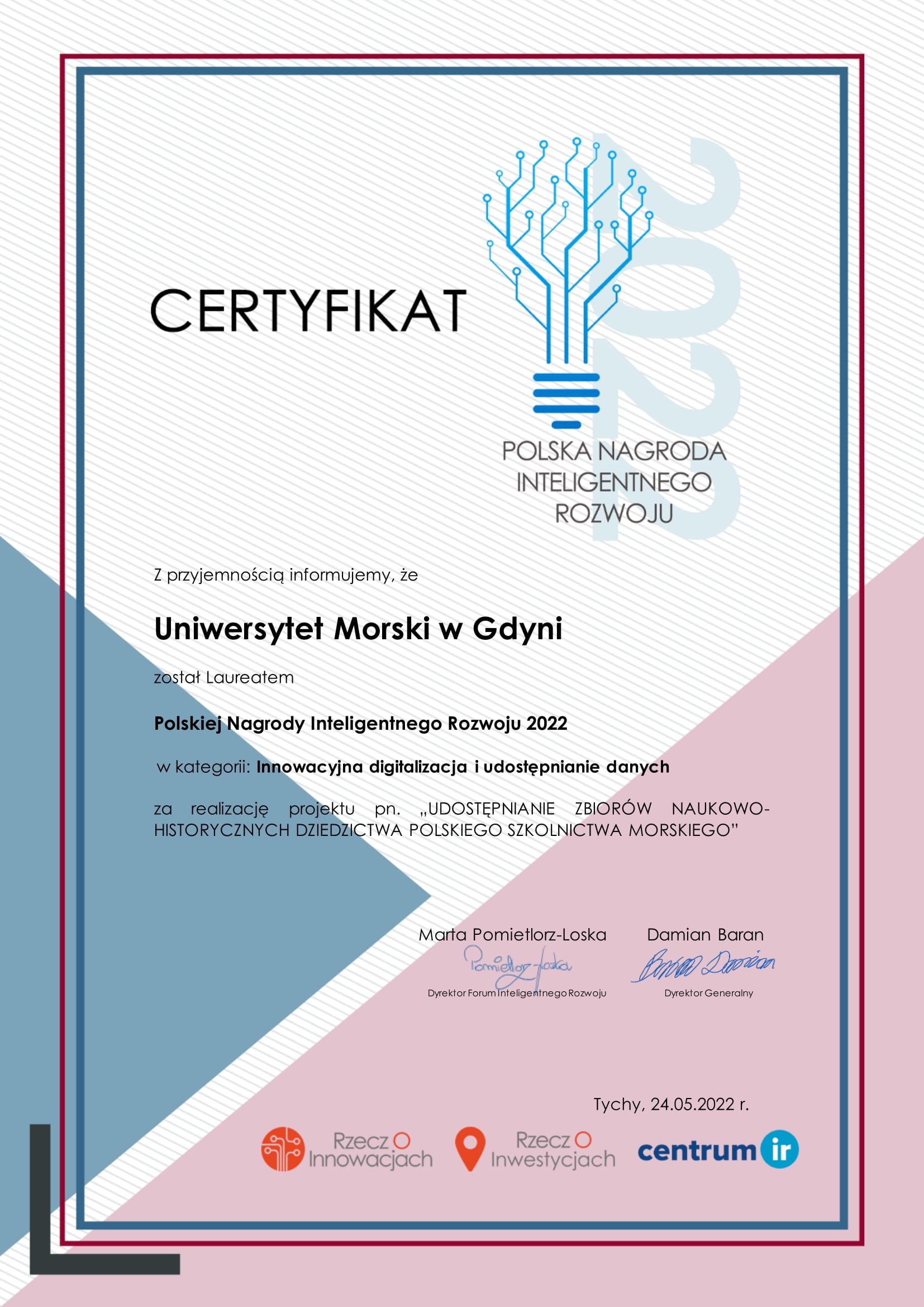Nagrodę Uniwersytetowi przyznano za projekt „Udostępnianie zbiorów naukowo-historycznych dziedzictwa polskiego szkolnictwa morskiego”, a zostanie ona odebrana przez Prorektora ds. Nauki dr. hab. Dariusza Barbuchę prof. UMG podczas uroczystej 7. Gali Nagród Forum Inteligentnego Rozwoju w Uniejowie w dniu 7 czerwca 2022 roku. Tegoroczne Forum Inteligentnego Rozwoju odbędzie się w dniach 6-8 czerwca w Uniejowie pod hasłem „Dbamy o klimat dla odkryć – promujemy postęp!”.