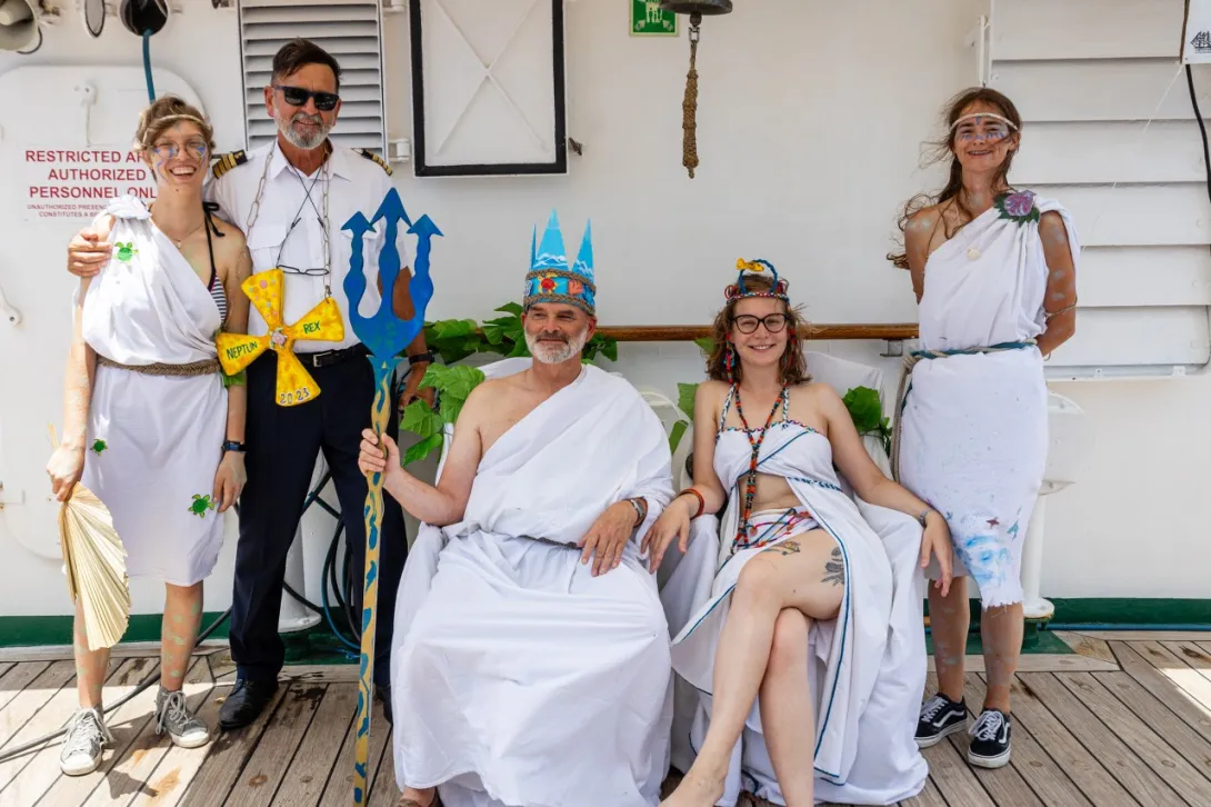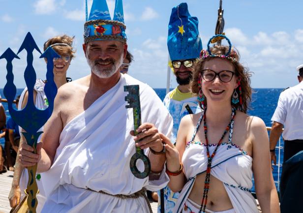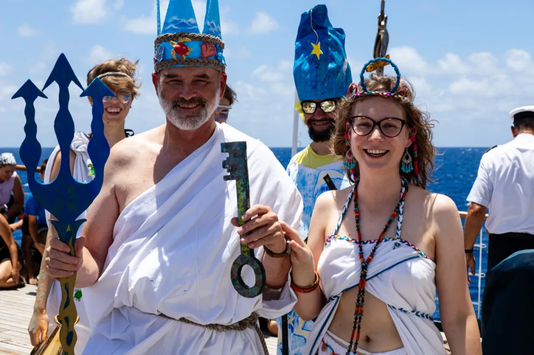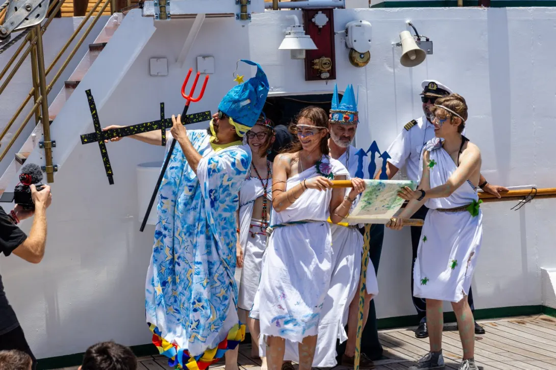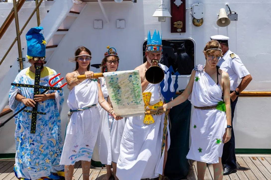 Oprócz Neptuna, Prozerpiny, Trytona i diabłów nie zbrakło astrologa, którego zadaniem było potwierdzenie przekraczanie równika oraz golibrody wyposażonego w ostrą brzytwę. Po szeregu prób Neptun wręczył certyfikaty będące świadectwem chrztu równikowego i nowe żeglarskie imię.