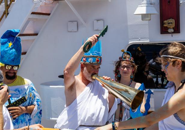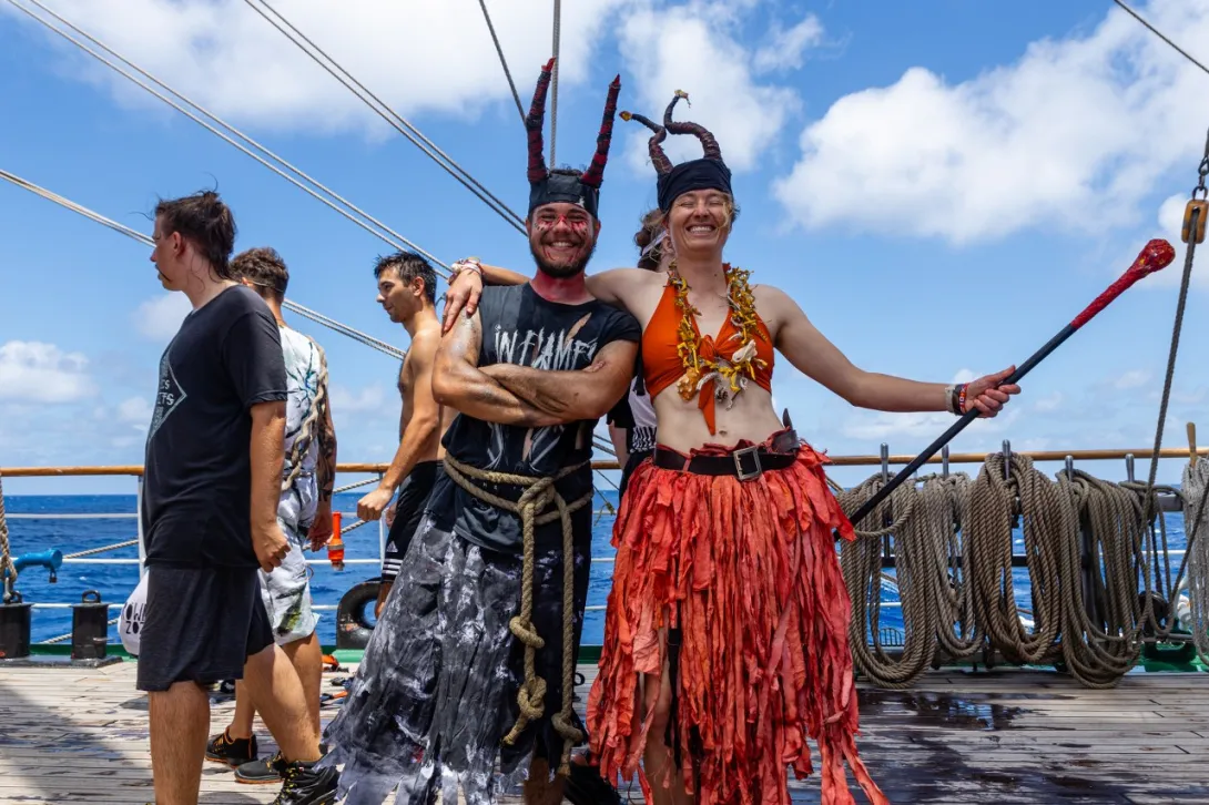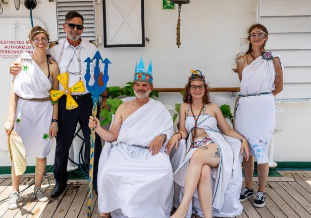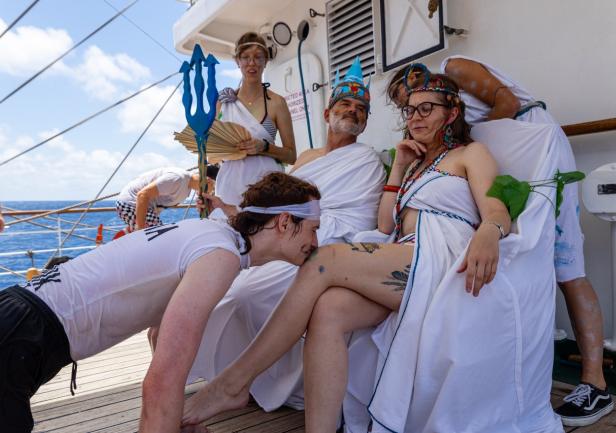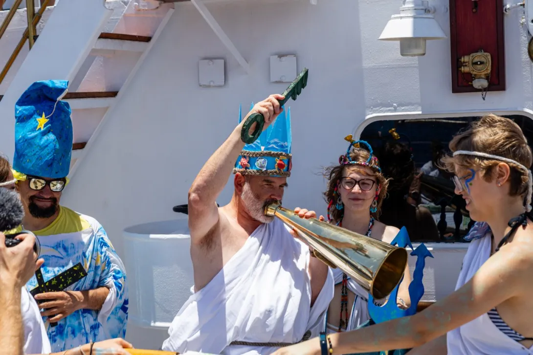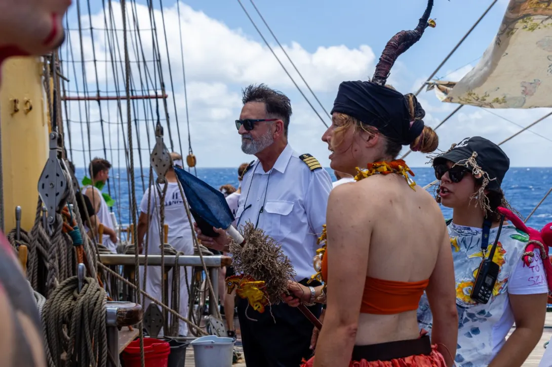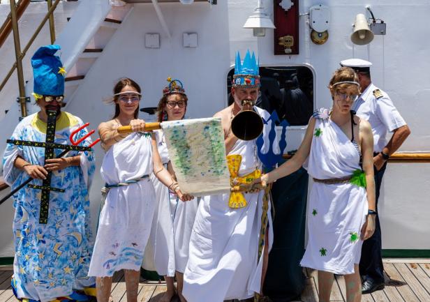 Oprócz Neptuna, Prozerpiny, Trytona i diabłów nie zbrakło astrologa, którego zadaniem było potwierdzenie przekraczanie równika oraz golibrody wyposażonego w ostrą brzytwę. Po szeregu prób Neptun wręczył certyfikaty będące świadectwem chrztu równikowego i nowe żeglarskie imię.