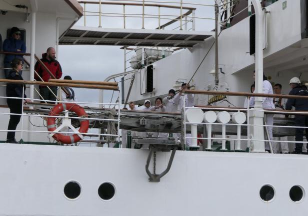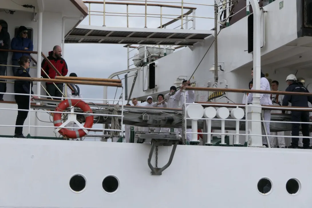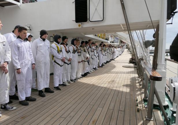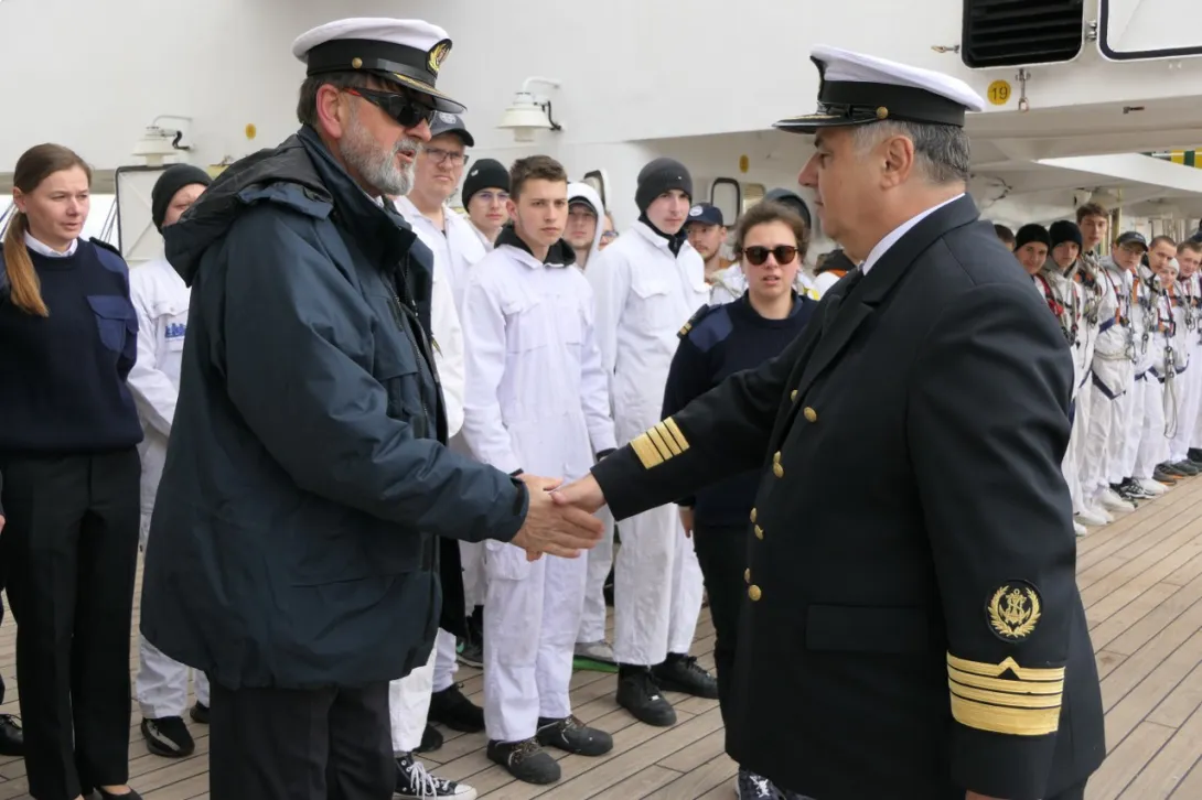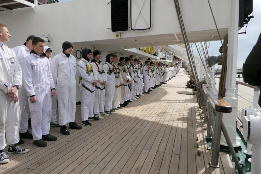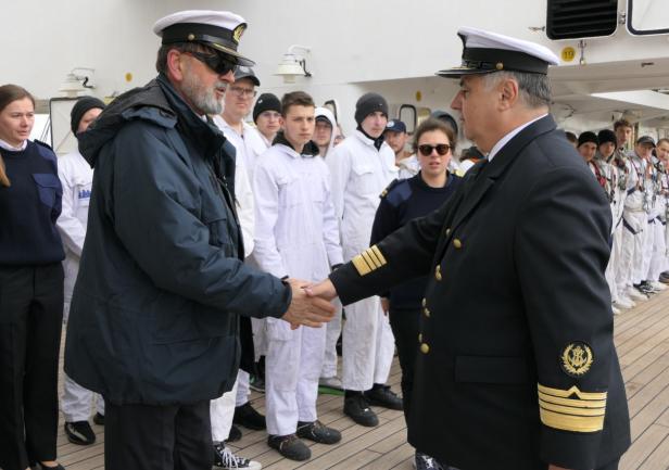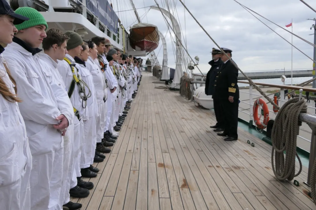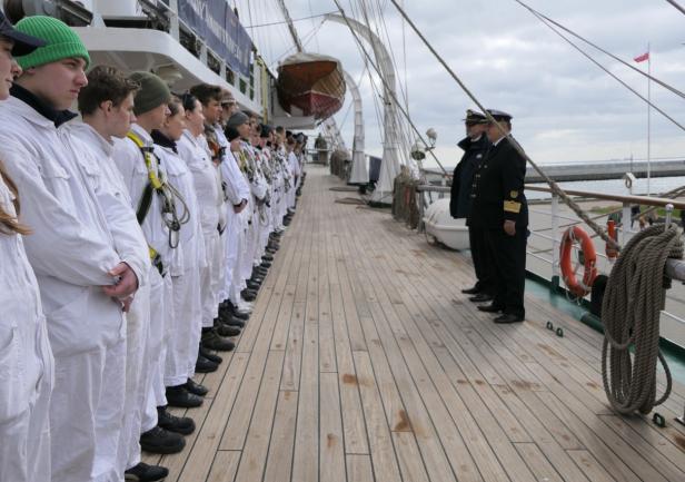 Po rozstawieniu trapu jako pierwszy na pokład fregaty wszedł JM Rektor, który po przywitaniu z Komendantem „Daru Młodzieży” kpt. ż.w. Rafałem Szymańskim dokonał przeglądu załogi i przywitał się z praktykantami.