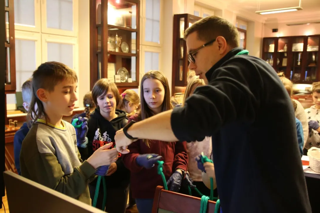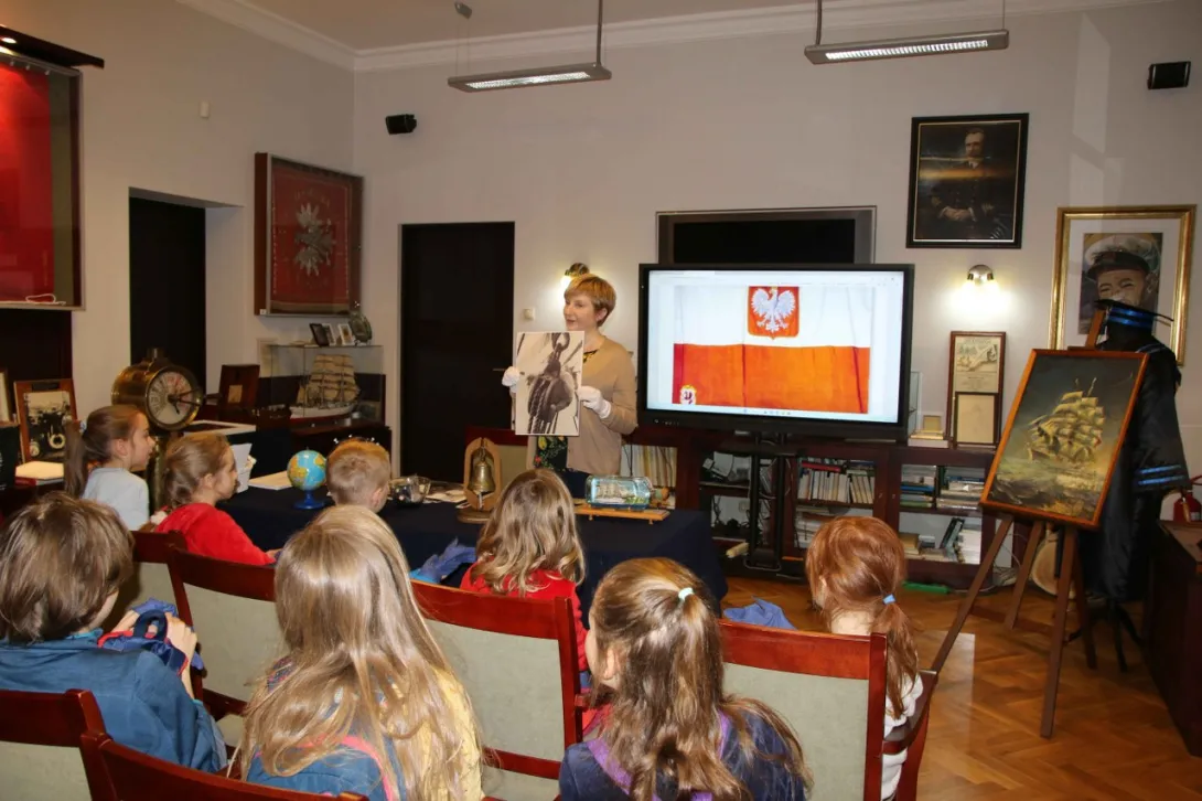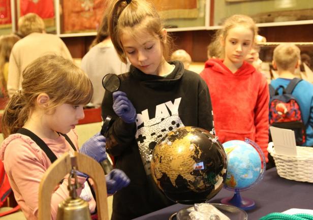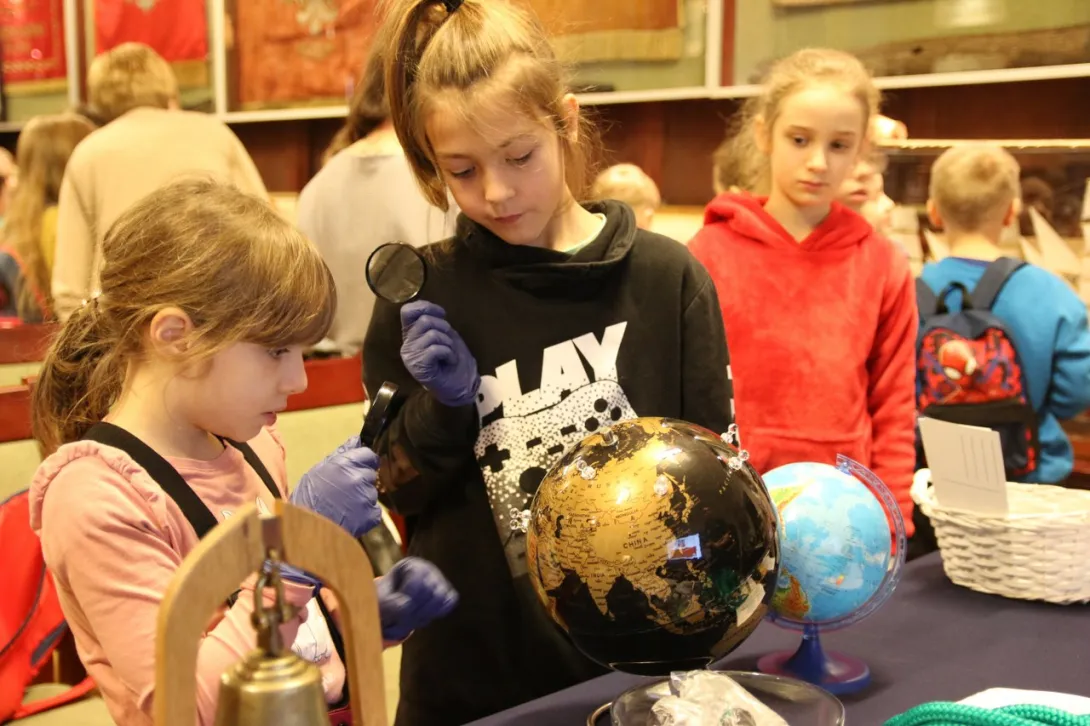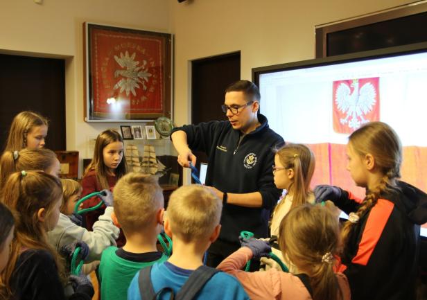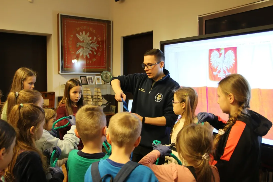 Dzieci z dużym zainteresowaniem oglądały eksponaty, korzystając z lup, wysłuchały również mini wykładu o morskich tradycjach wygłoszonego przez Panią mgr Joannę Stasiak. Pan Michał Kołodziejczak z Biura Promocji i Komunikacji zaprezentował świst trapowy, a także wiązanie wybranych węzłów. Dzieci dowiedziały się między innymi, czym jest konserwacja, oglądając eksponaty przechowywane w Sali Tradycji i porównując te sprzed i po konserwacji.