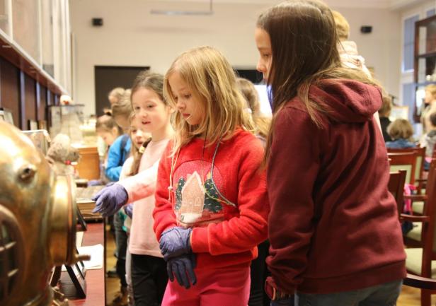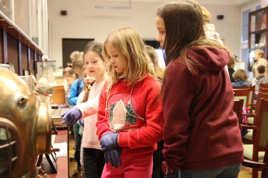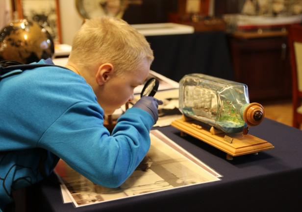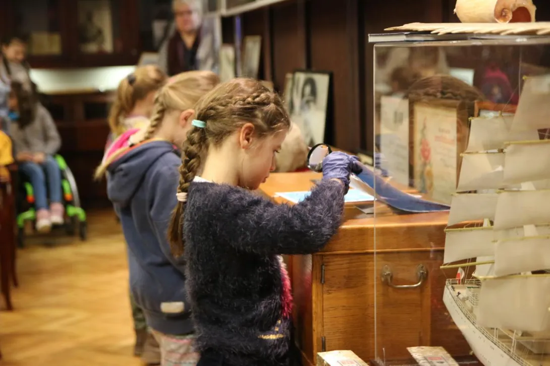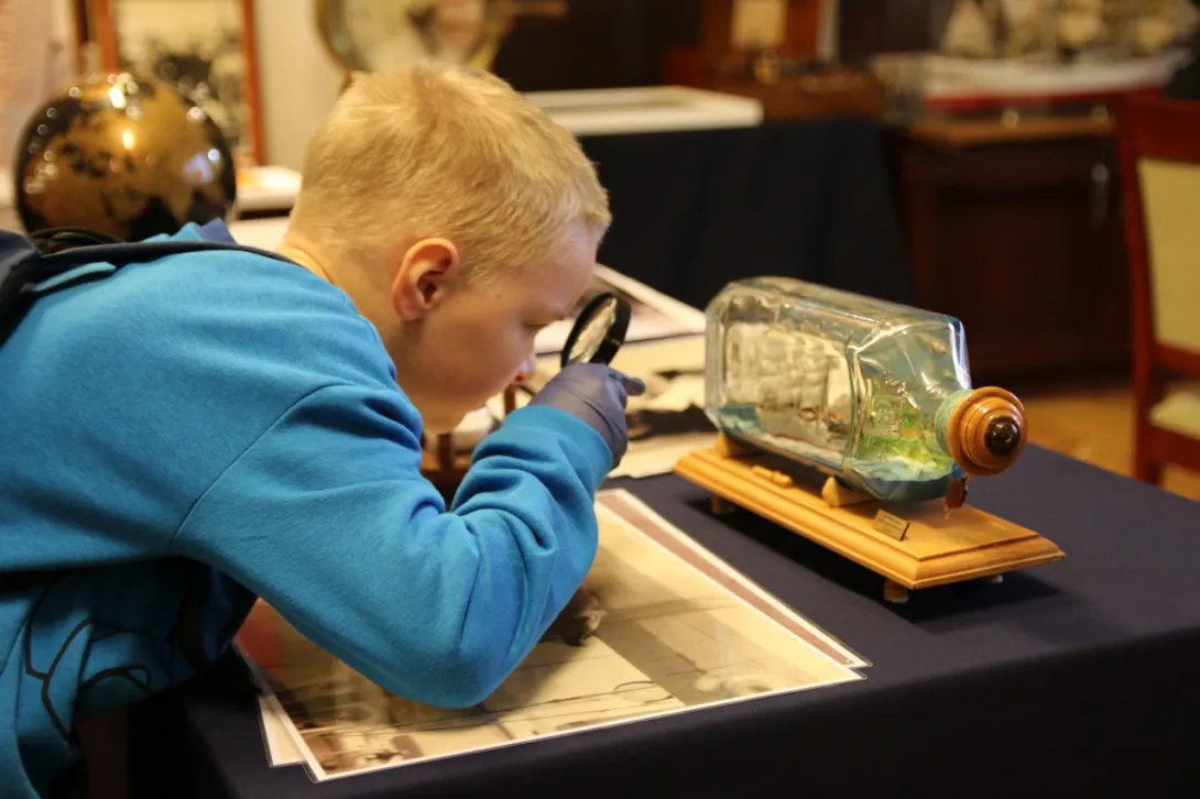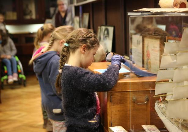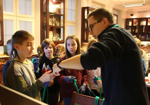 Dzieci z dużym zainteresowaniem oglądały eksponaty, korzystając z lup, wysłuchały również mini wykładu o morskich tradycjach wygłoszonego przez Panią mgr Joannę Stasiak. Pan Michał Kołodziejczak z Biura Promocji i Komunikacji zaprezentował świst trapowy, a także wiązanie wybranych węzłów. Dzieci dowiedziały się między innymi, czym jest konserwacja, oglądając eksponaty przechowywane w Sali Tradycji i porównując te sprzed i po konserwacji.