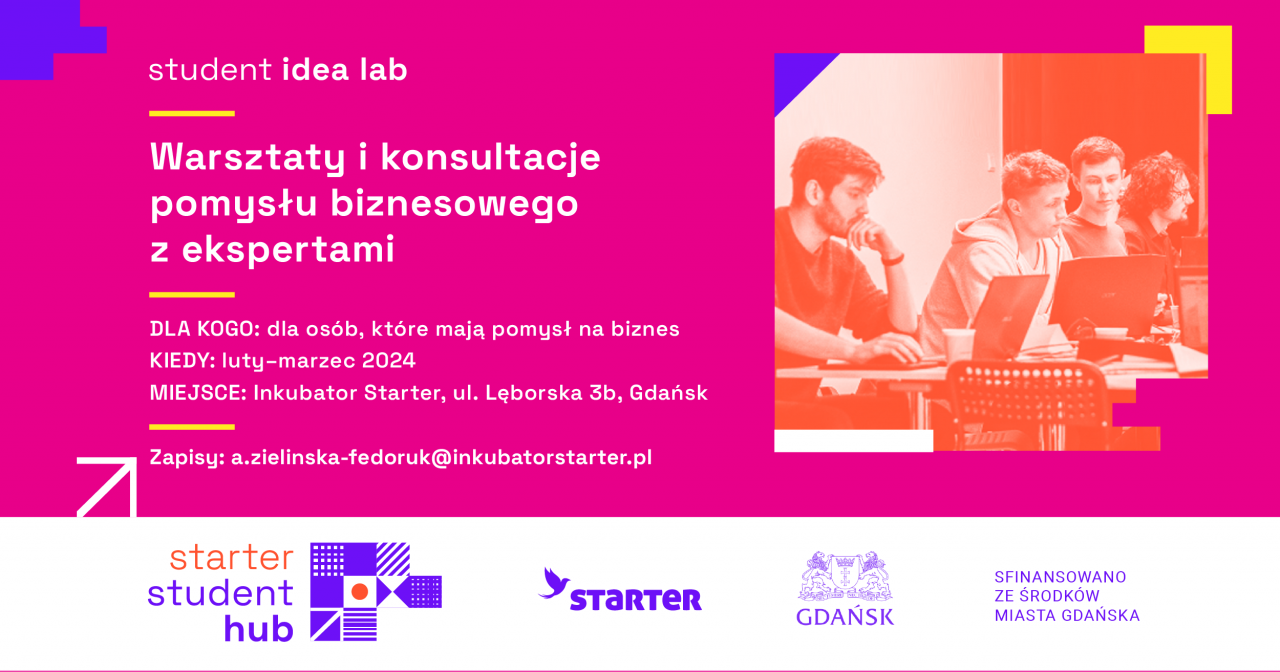 Gdańska Fundacja Przedsiębiorczości I Gdański Inkubator Przedsiębiorczości STARTER zaprasza studentów i studentki, którzy mają już mniej lub bardziej wyklarowany pomysł na własny biznes do drugiej części projektu – ścieżki Student Idea Lab, która będzie miała miejsce w lutym-marcu 2024. Jest to część warsztatowa, gdzie w niewielkiej grupie (max. 15 osób!) pod okiem eksperta, podczas 5 spotkań (po 3 godziny każde) każdy z uczestników będzie opracowywał swój konkretny plan biznesowy. Będzie również możliwość skorzystania z konsultacji eksperckich z zakresu prawa, marketingu, zarządzania projektem etc. Na zakończenie tej ścieżki odbędzie się Student Deck, a najoryginalniejszy pomysł otrzyma nagrodę finansową ufundowaną przez Gdańską Fundację Przedsiębiorczości.