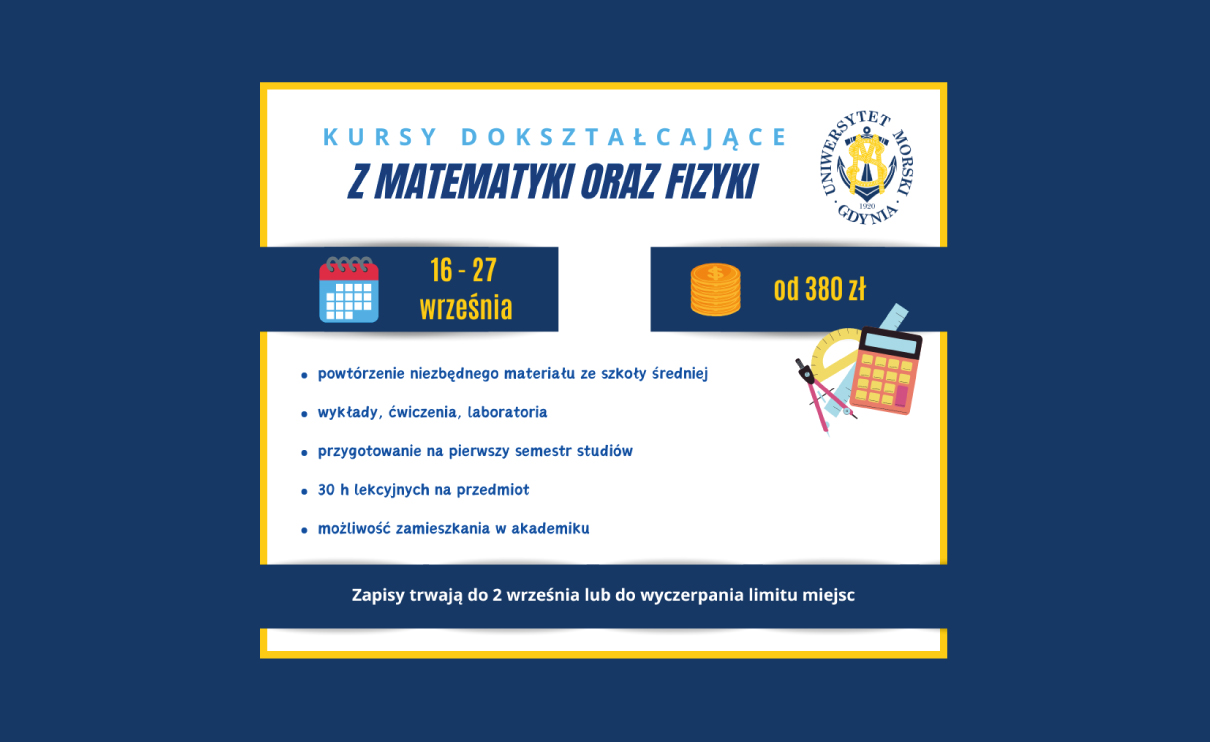 Wydział Mechaniczny Uniwersytetu Morskiego w Gdyni organizuje kursy dokształcające z matematyki oraz fizyki dla studentów przyjętych na I rok dla wszystkich wydziałów.