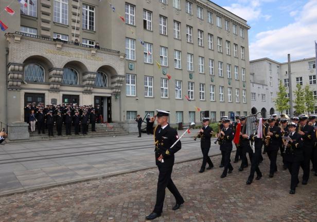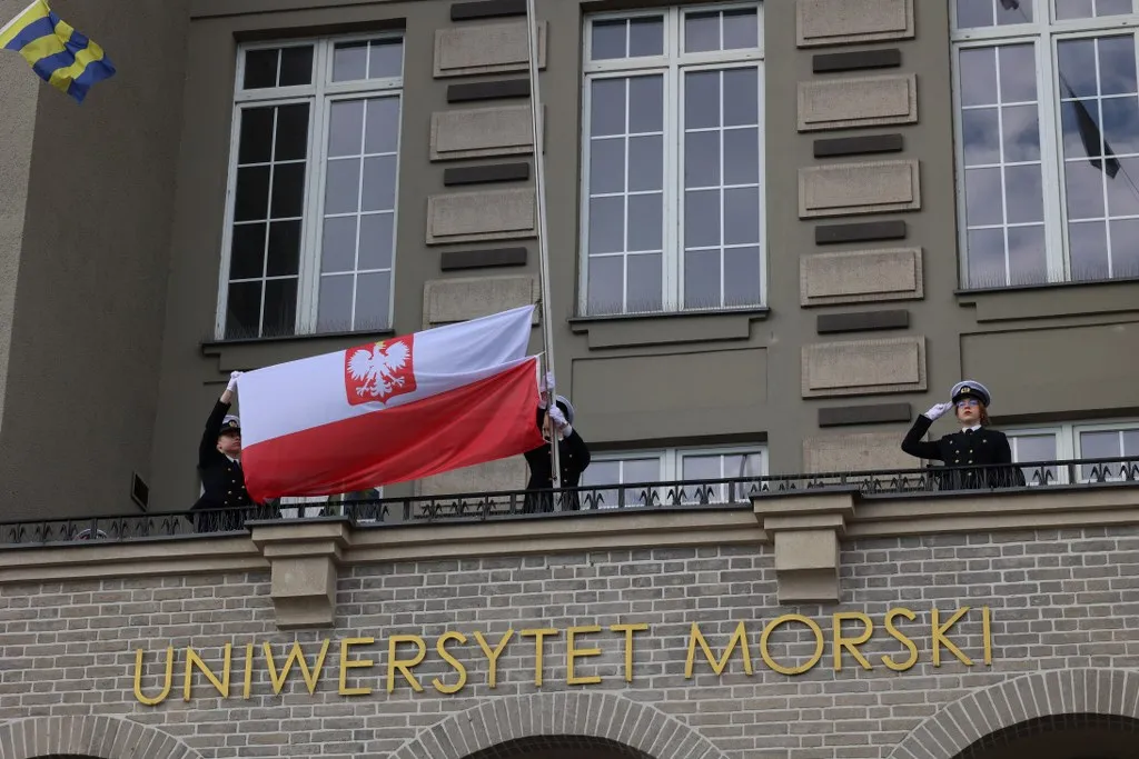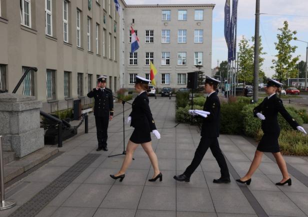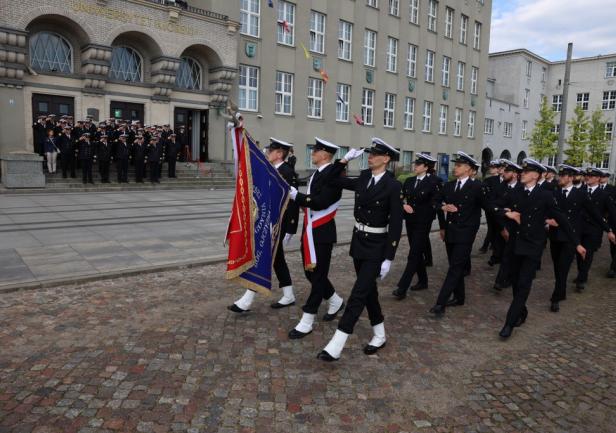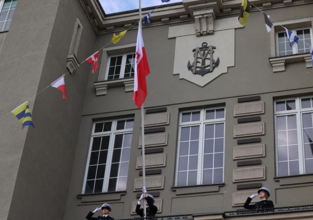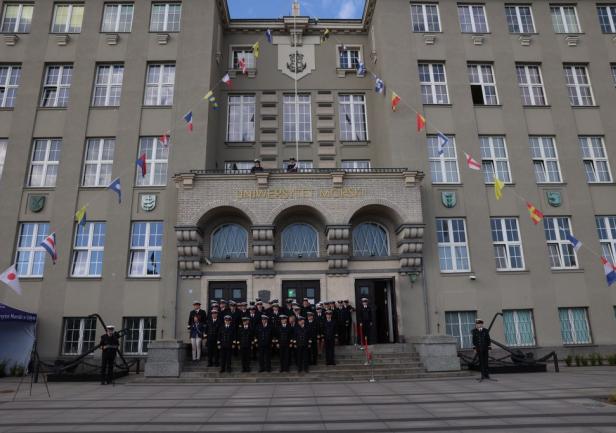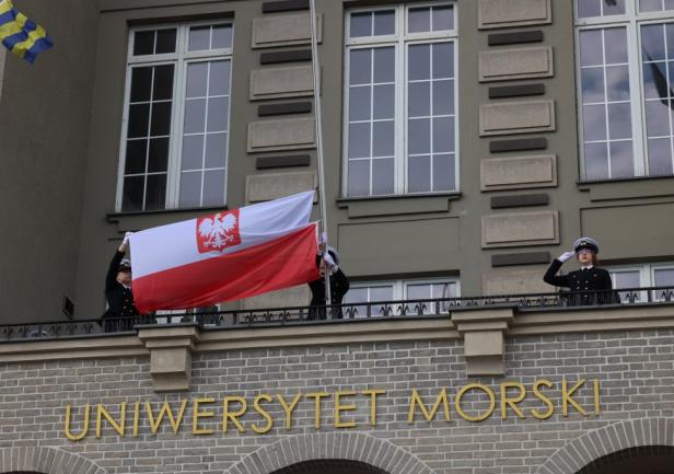 Biało-czerwona bandera Polskiej Marynarki Handlowej została podniesiona na gmachu głównym Uniwersytetu punktualnie o godzinie 8:00.