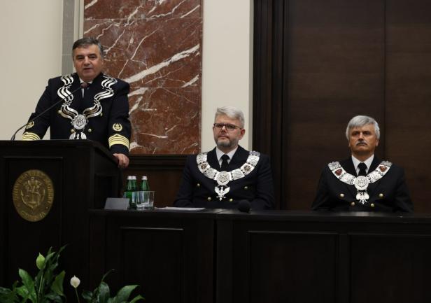 W swoim wystąpieniu JM Rektor prof. dr hab. inż. kpt. ż.w. Adam Weintrit przypomniał także o sukcesach pracowników Uniwersytetu, w tym o nadanych przez Prezydenta Rzeczypospolitej Polskiej odznaczeniach państwowych – Krzyżu Oficerskim Orderu Odrodzenia Polski dla prof. dr. hab. inż. Lecha Murawskiego oraz Krzyżu Komandorskim Orderu Odrodzenia Polski dla prof. dr. hab. inż., dr. h.c. Janusza Mindykowskiego.