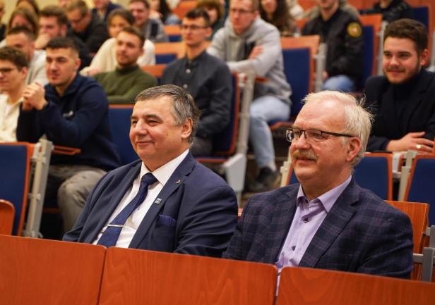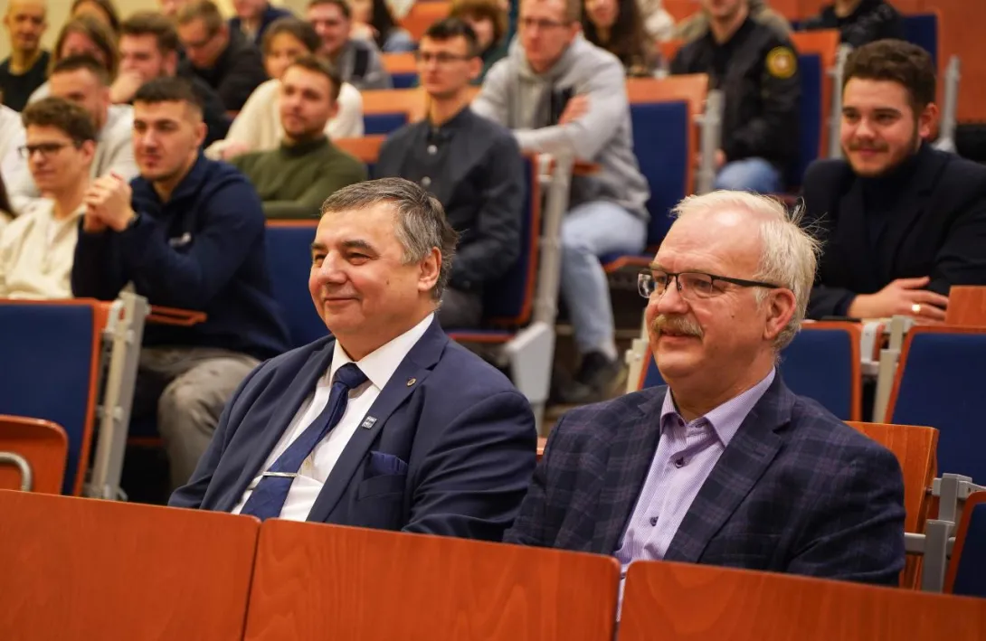 Po przywitaniu prof. Parkinson wygłosił wykład dla zgromadzonych w Audytorium Maximum studentów Uniwersytetu Morskiego w Gdyni. Tematem wykładu była historia początków systemu GPS – Globalnego Systemu Pozycjonowania.