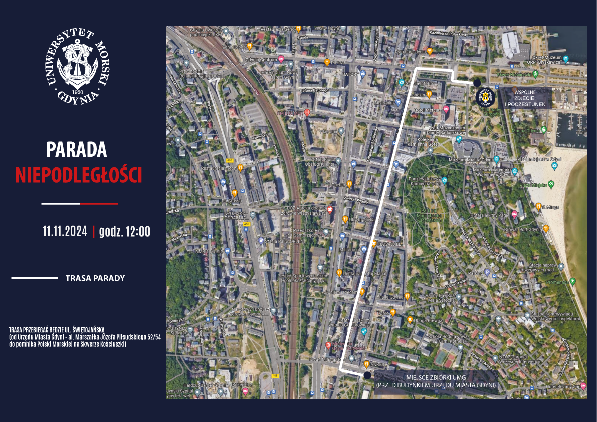 Parada Niepodległości, która odbędzie się w poniedziałek, 11 listopada 2024 roku, rozpocznie się o godz. 12:00. Zbiórka dla studentów Uniwersytetu Morskiego w Gdyni zaplanowana została na godz.11:00 przed Urzędem Miasta Gdyni (niedaleko pizzerii „Anker”). Do godz. 11:15 będzie trwało formowanie szyku UMG, by następnie włączyć się do ogólnego szyku Parady. Będziemy przemieszczać się al. Marszałka Józefa Piłsudskiego w kierunku Urzędu Miasta Gdyni. Pracownicy i doktoranci wraz z rodzinami proszeni są o przybycie na miejsce zbiórki (przed budynkiem Urzędu Miasta Gdyni, niedaleko pizzerii „Anker”) na godz. 11:30.