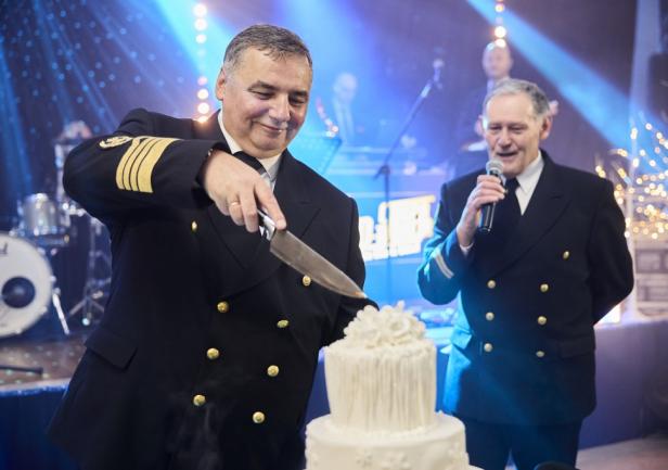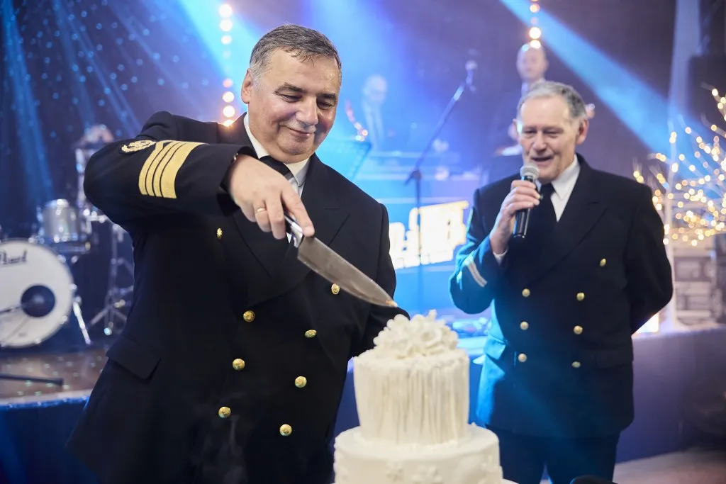 Na niecałą godzinę przed północą gości czekała słodka niespodzianka - na salę wjechał tort, którego pierwszy kawałek ukroił JM Rektor. Następnie wybrano najbardziej roztańczoną parę Tradycyjnego Jubileuszowego Balu Morskiego Uniwersytetu Morskiego w Gdyni. Szampańska zabawa trwała do białego rana, a jego uczestnicy, opuszczając mury Uczelni, deklarowali chęć udziału w następnym Balu Morskim.