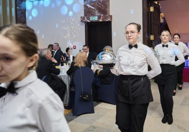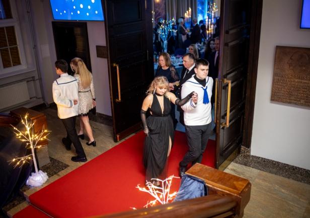 Przybyłych na bal gości witał wraz z małżonką JM Rektor prof. dr hab. inż. kpt. ż.w. Adam Weintrit, zapraszając do wspólnego, pamiątkowego zdjęcia na tle ścianki, swoją scenerią nawiązującą do baśniowej krainy lodu. Następnie, studenci Uczelni prowadzili gości do stolików, które w tym roku nosiły imiona znanych żeglarzy i odkrywców geograficznych, m.in. Krzysztofa Kolumba, Vasco da Gamy czy Ferdynanda Magellana.