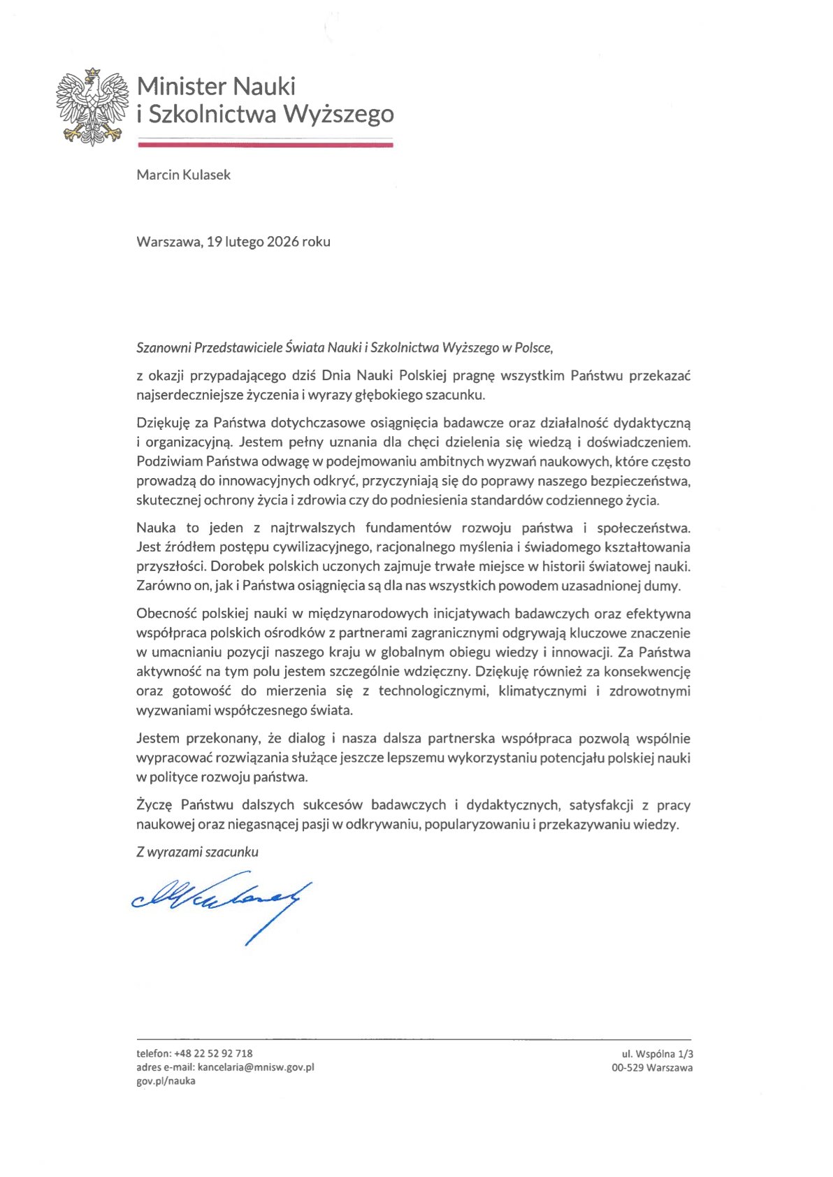W związku z obchodami Dnia Nauki Polskiej Minister Nauki i Szkolnictwa Wyższego Marcin Kulasek skierował uroczysty list do środowiska naukowego: