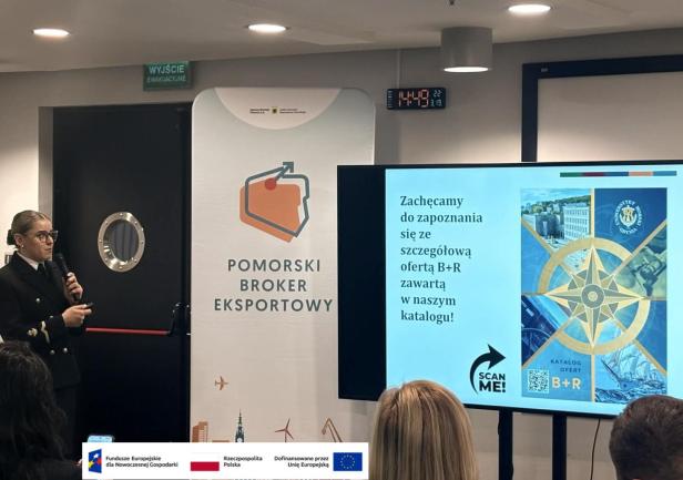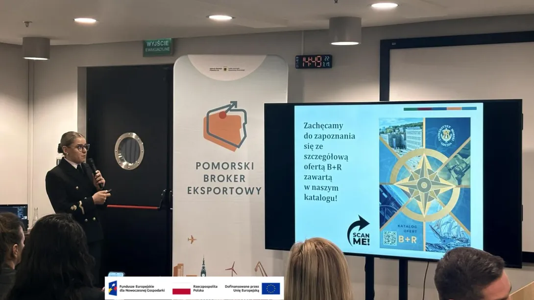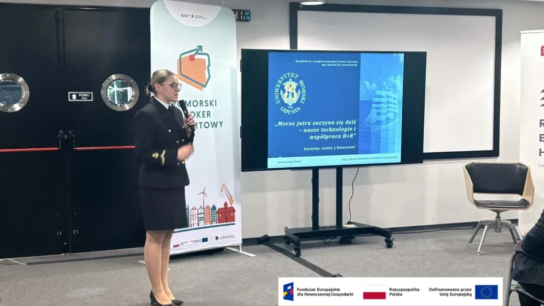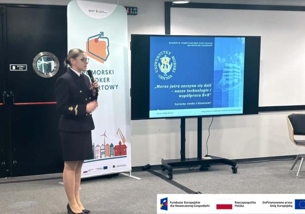 Istotnym punktem programu była prezentacja pt. „Morze jutra zaczyna się dziś – nasze technologie i współpraca B+R”, przygotowana przez brokerkę z Centrum Transferu Technologii UMG - mgr Marlenę Żur-Lewandowską na zaproszenie Polskiej Agencji Inwestycji i Handlu. Wystąpienie dotyczyło innowacyjnych rozwiązań kreowanych na uczelni oraz możliwości ich wdrażania we współpracy z przemysłem, wpisując się w założenia realizowanego w uczelni projektu „Science4Business – Nauka dla Biznesu”, którego celem jest zwiększenie efektywności współpracy uczelni z biznesem oraz komercjalizacja wyników B+R. Działanie realizowane w ramach zadania nr 1 „Inkubator Rozwoju” projektu niekonkurencyjnego pn. „Science4Business - Nauka dla Biznesu” dofinansowanego ze środków Unii Europejskiej w ramach działania 2.5 Programu Fundusze Europejskie dla Nowoczesnej Gospodarki na lata 2021-2027".