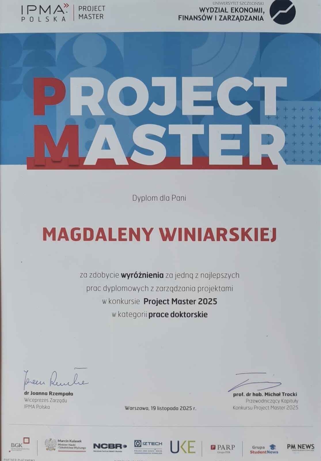 Wyróżnienie za jedną z najlepszych prac dyplomowych z zarządzania projektami w konkursie Project Master 2025 w kategorii prace doktorskie.