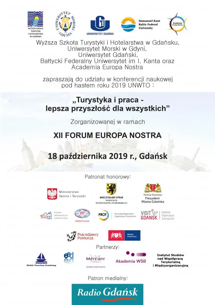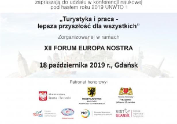 Uniwersytet Morski w Gdyni jest współorganizatorem Międzynarodowej Konferencji Naukowej „Turystyka i praca – lepsza przyszłość dla wszystkich”. Konferencja odbędzie się w Gdańsku w dniach 17-18 października 2019 r. w ramach XII Forum Europa Nostra. Jej tematyka nawiązuje do hasła przewodniego Światowej Organizacji Turystyki UNWTO na rok 2019 „Tourism and jobs - a better future for all”. Inicjatorem i koordynatorem naukowym wydarzenia z ramienia uczelni jest Katedra Zarządzania i Ekonomii, z kolei koordynatorem organizacyjnym międzynarodowe stowarzyszenie „Academia Europa Nostra”.